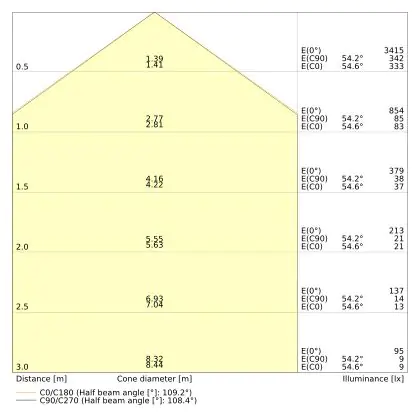 Le code couleur se compose de l'indice de rendu des couleurs (IRC) et de la température de couleur (Kelvin). Le premier chiffre indique le rendu des couleurs (1 = très mauvais rendu des couleurs, 9 = meilleure authenticité des couleurs). Le deuxième et troisième chiffre indiquent la température de la couleur. Exemple : Le code couleur "830" indique que la lampe a un bon rendu des couleurs (8) et une couleur de lumière blanche chaude (30 = 3000K). |