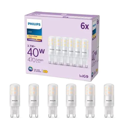 Les ampoules LED G9 sont des petites ampoules en forme de capsule. Ces ampoules vous permettront de remplacer vos ampoules à incandescence et à économies d’énergie sans modification de votre installation actuelle. Cette ampoule Lot 6x Philips LED Capsule G9 Dépolie 3.7W 470lm - 827 est la variante à LED de l’ampoule G9 classique. Cette ampoule Philips se caractérise par sa faible consommation d’énergie. Elle n’utilise que 3.7 W, pour fournir une lumière de haute qualité. Cette ampoule LED est produite par Philips, une marque réputée en matière d'éclairage. Vous êtes donc assuré de sa qualité.