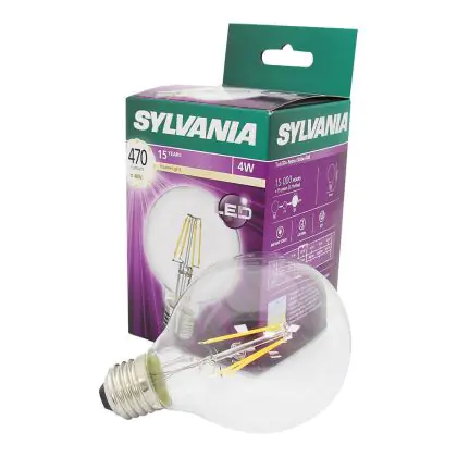 Cette ampoule Sylvania Retro ToLEDo E27 Globe 80mm Filament Claire 4W 470lm - 827 | Remplacement 40W avec son efficacité lumineuse de lumen par watt vous permettra de profiter d’un éclairage de qualité. Avec sa durée de vie de 15000 heures, vous n’aurez pas à vous soucier de son remplacement avant quelques années.